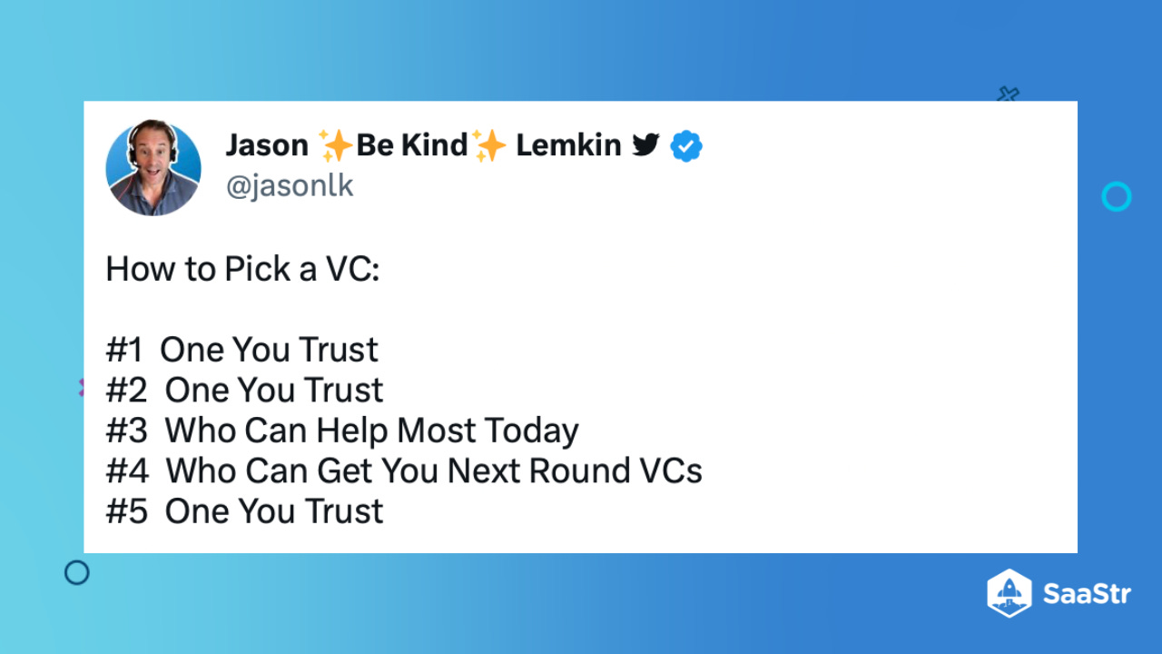 #3. Who will the Next Round VCs most want to follow? This is hard to know without really asking, but if you pick a VC that other great VCs want to follow, the next round will likely be much, much easier. This is one reason to pick a more successful VC. A lot of folks will want to invest in the next round of their startups. A lot of them. With a newer VC, or less successful one, it will be much more on you to find the next round of investors.