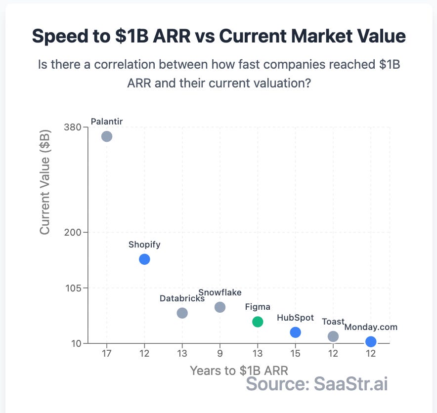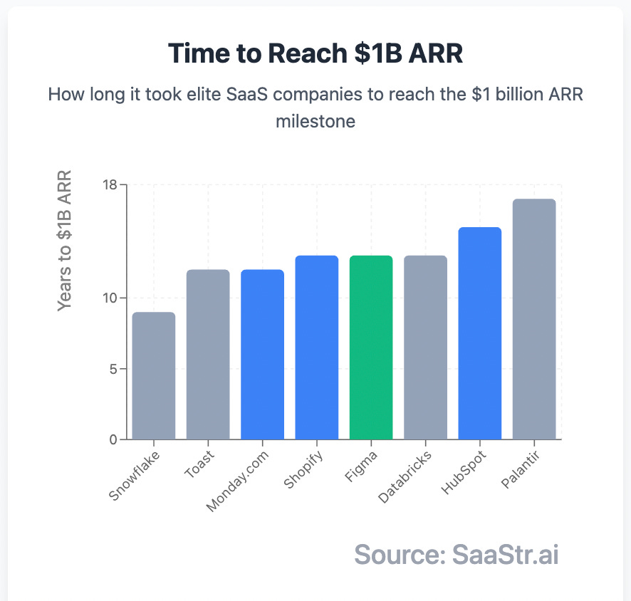 Figma took 13 years to reach $1B ARR—4 years longer than Snowflake. But consider what Figma achieved: