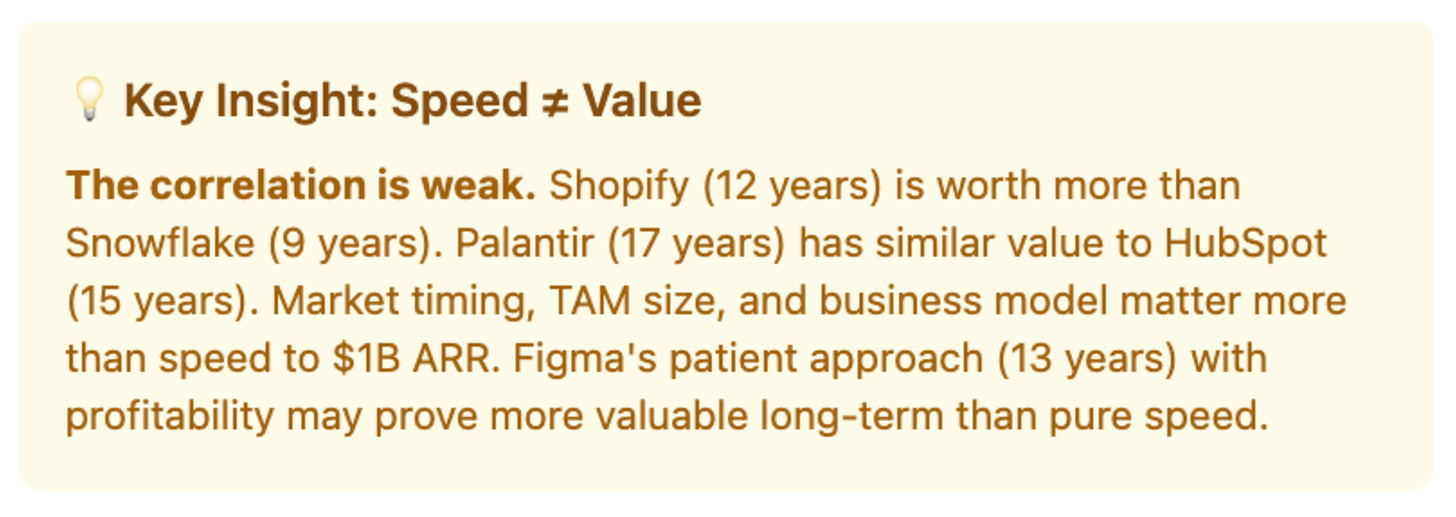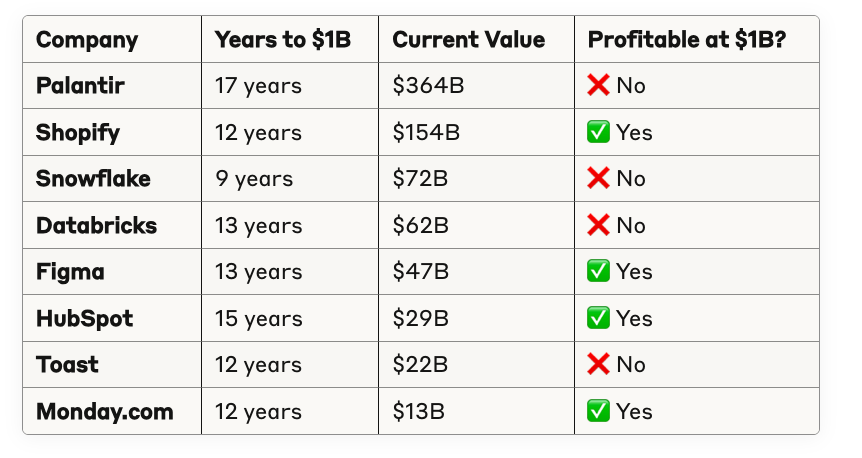 But in the end, market TAM, business model, and post-$1B execution matter far more than how quickly you get there. Figma's patient 13-year journey with profitability may be just as or even more valuable than Snowflake's record 9-year sprint.