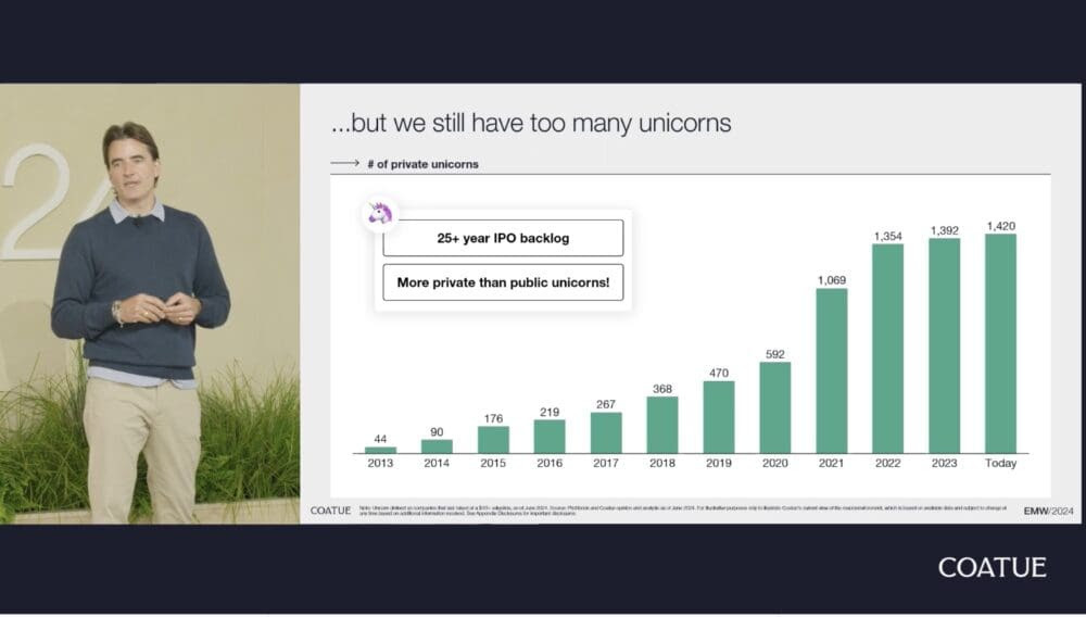 Now of course in theory, IPOs could dramatically exceed their historical pace. But assuming that doesn’t happen — and it’s been a very dry 2.5 years for IPOs — it would take 25 years to get through all the unicorns we already have.
