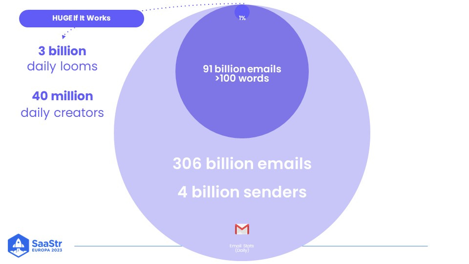 For example, the most ubiquitous messaging platform is email. If you took the daily emails sent and shrunk that down to long-form emails (because looms are 2-3 minutes on average) only. And then you capture only 1% of that long-form messaging opportunity. You end up with 3B daily looms and 40M daily creators.