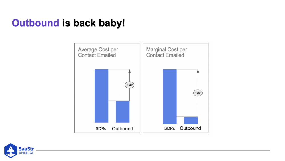 What this chart shows is the difference between the average cost per contact email between the automated Outbound team and the SDR team. So you have a 2.4x difference on the average cost, and then the marginal cost an 8x difference in costs. That’s very important there’s a lot of infrastructure, effort, humans, lots of technology, and lots of data vendors that you’re buying from just to set this all up. However, the benefit is that once it’s up and running, the marginal costs to keep it running are low and it begins to pay for itself. For example, at Gorgias, they were able to send out around a million emails in a quarter, covering each company in their TAM (Total Addressable Market) a couple of times each quarter while keeping costs low.