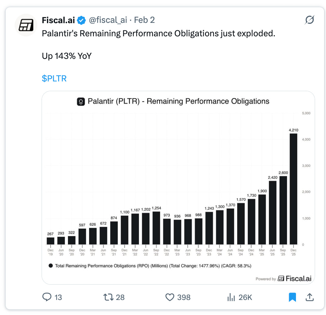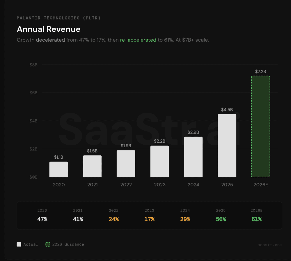 Growth went from 17% in 2023 to 29% in 2024 to 56% in 2025 to a guided 61% in 2026. At multi-billion dollar scale. The growth is accelerating. That’s not how enterprise software works. The law of large numbers is supposed to kick in. Deceleration is supposed to be inevitable. Palantir is defying all of it.
