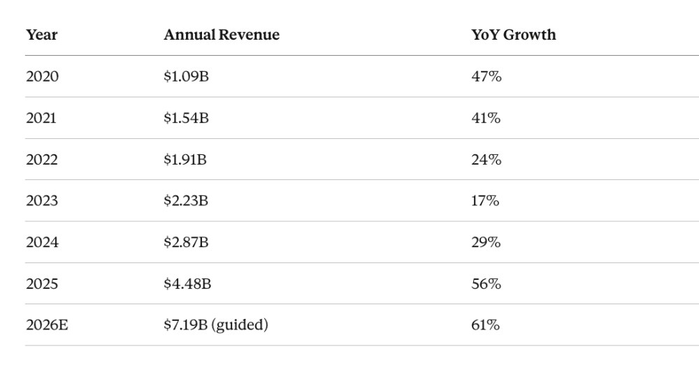 Full year adjusted free cash flow was $2.27 billion, a 51% margin, up 82% year-over-year. The 2026 guide is $3.9-$4.1 billion in adjusted FCF. Four billion dollars in free cash flow at a company growing 61%.