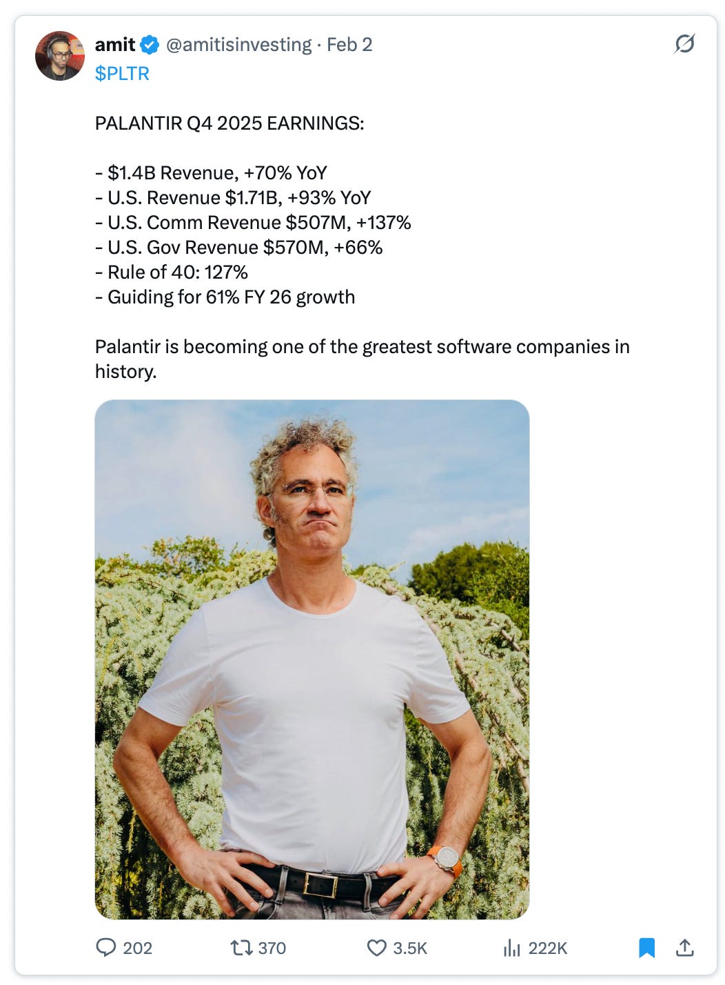 What Palantir delivered this quarter is the single most impressive quarter I’ve ever seen from an enterprise software company. Full stop. If they keep anything close to this pace through 2026, the “Greatest Ever” question stops being hypothetical.