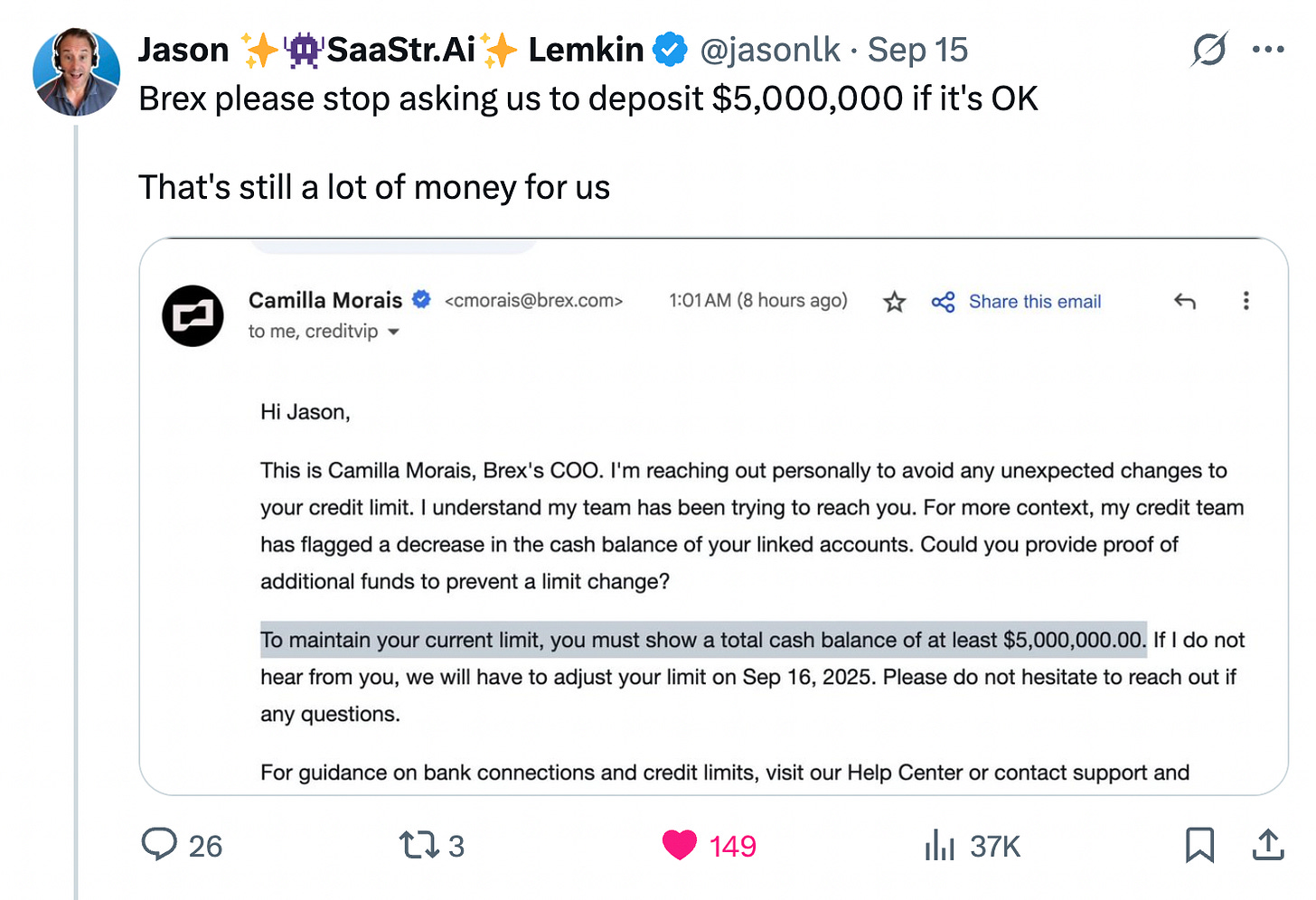 Brex kept sending alarming emails to us demanding we “immediately deposit $5 million at Brex” to maintain credit limits. When I tried their AI support (using Decagon), it wouldn’t even let me chat with AI or humans - it just closed the window.