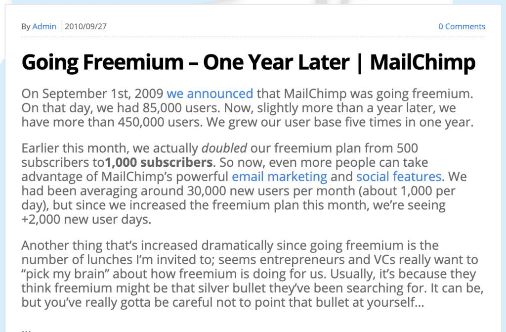 4. It can take 24+ mos. to get to real Product Market Fit. Mailchimp didn’t really have product-market fit until it went Freemium a full 2 years in. We’ve talked for years on SaaStr on how you have to budget 24 months to really get something off the ground in SaaS. Here’s another case study. It also took Mailchimp 24 months, and a tilt to freemium (which they initially resisted), to even get to $1m in ARR. A bit more here.